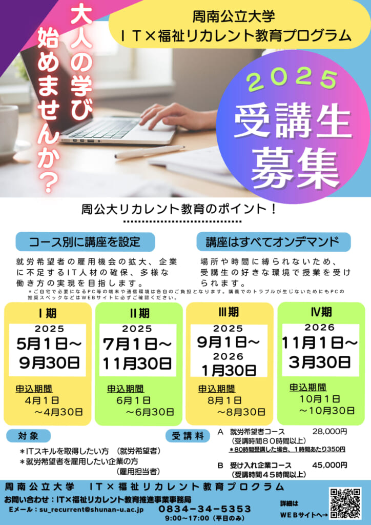 周南公立大学IT×福祉リカレント教育プログラムは、職場勤務が困難な方とその受入企業を対象に以下の2つのプログラムを提供し就労希望者の雇用を促進します。