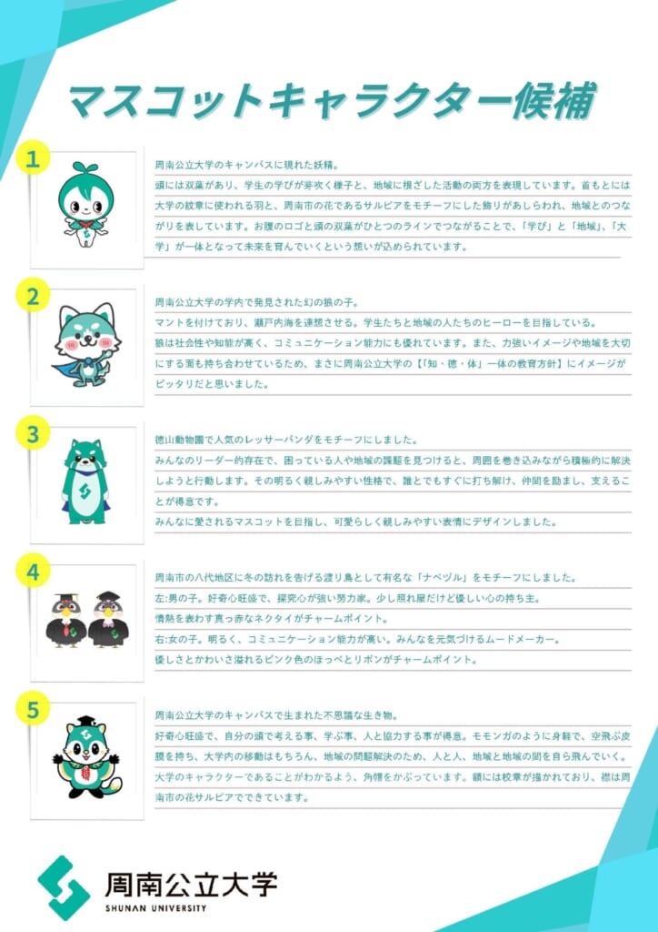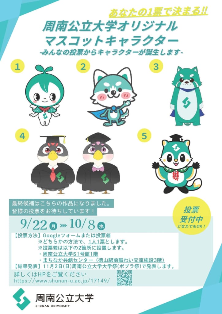 地域に愛され、地域に信頼され、地域の誇りと思っていただける「地域に輝く大学」を目指し、学生・教職員だけでなく広く地域の皆様から周南公立大学に親しみをもっていただけるようなマスコットキャラクターを作成することになり、6月中旬~8月上旬にデザインの公募をおこないました。 その結果、応募総数283件と、幅広い年齢、地域の方々から、たいへん多くの応募をいただきました。応募してくださった皆様に感謝いたします。集まった作品は、学内の「マスコットキャラクター選定委員会」で選定を行い、最終選考となる一般投票を実施します。