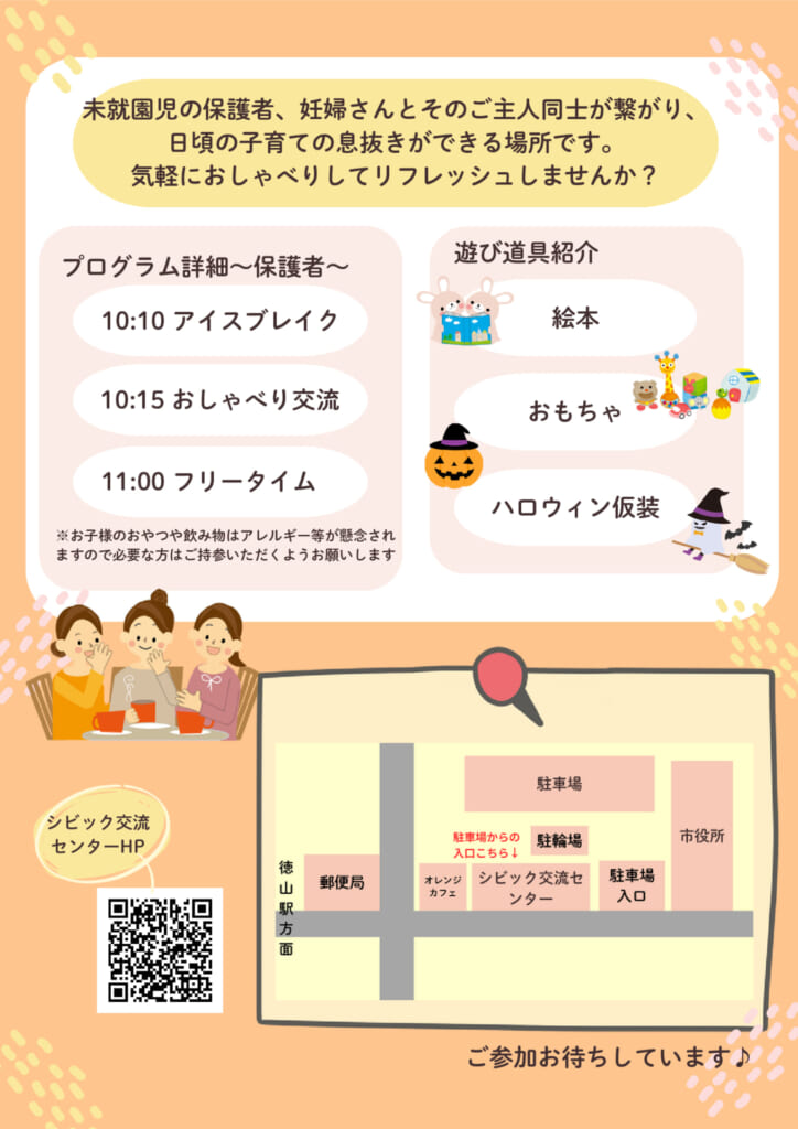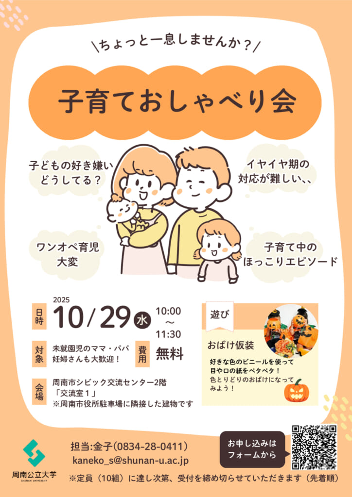 本イベントは、未就園児の保護者やこれから子育てを始める方々が、日々の子育てに関する悩みや工夫を気軽に語り合い、情報を共有できる場として企画されたものです。「子どもの好き嫌い、どうしてる?」「イヤイヤ期の対応が難しい」など、子育てに関する身近なテーマをもとに、同じ立場の参加者同士がリラックスした雰囲気の中で交流を深めます。 当日は、お子さまと一緒にご参加いただける内容となっており、ハロウィンにちなんだ「おばけの仮装づくり」も実施予定です。 親子で楽しみながら、地域の子育て仲間とつながる機会として、ぜひご活用ください。 本イベントは、地域ゼミの学生が企画・運営を担い、地域の子育て支援に貢献する実践的な学びの場としても位置づけられています。子育てに関心のある方、これから子育てを始める方のご参加を心よりお待ちしております。 【開催概要】 日時:2025年10月29日水曜日 10時~11時30分 会場:周南市シビック交流センター 2階 交流室1 内容:子育てに関する自由なおしゃべり、ハロウィン仮装づくり(お子さま向け) 対象:未就園児の保護者、これから子育てを始める方 定員:先着10組(定員になり次第締切) 参加費:無料【お申し込み】