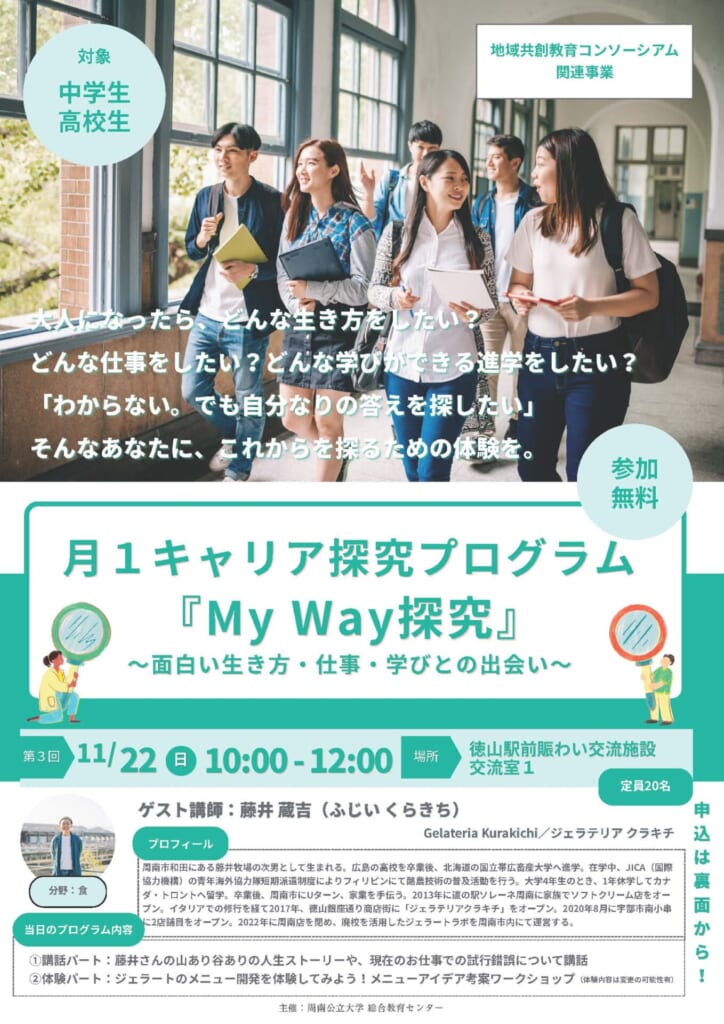 周南地域の中学生・高校生を対象とした月1キャリア探究プログラム「My Way探究」の第3回を開催します。今回は「食」をテーマに、ジェラテリア クラキチの藤井蔵吉さんをゲスト講師にお招きします。多くの方のご参加をお待ちしております。
