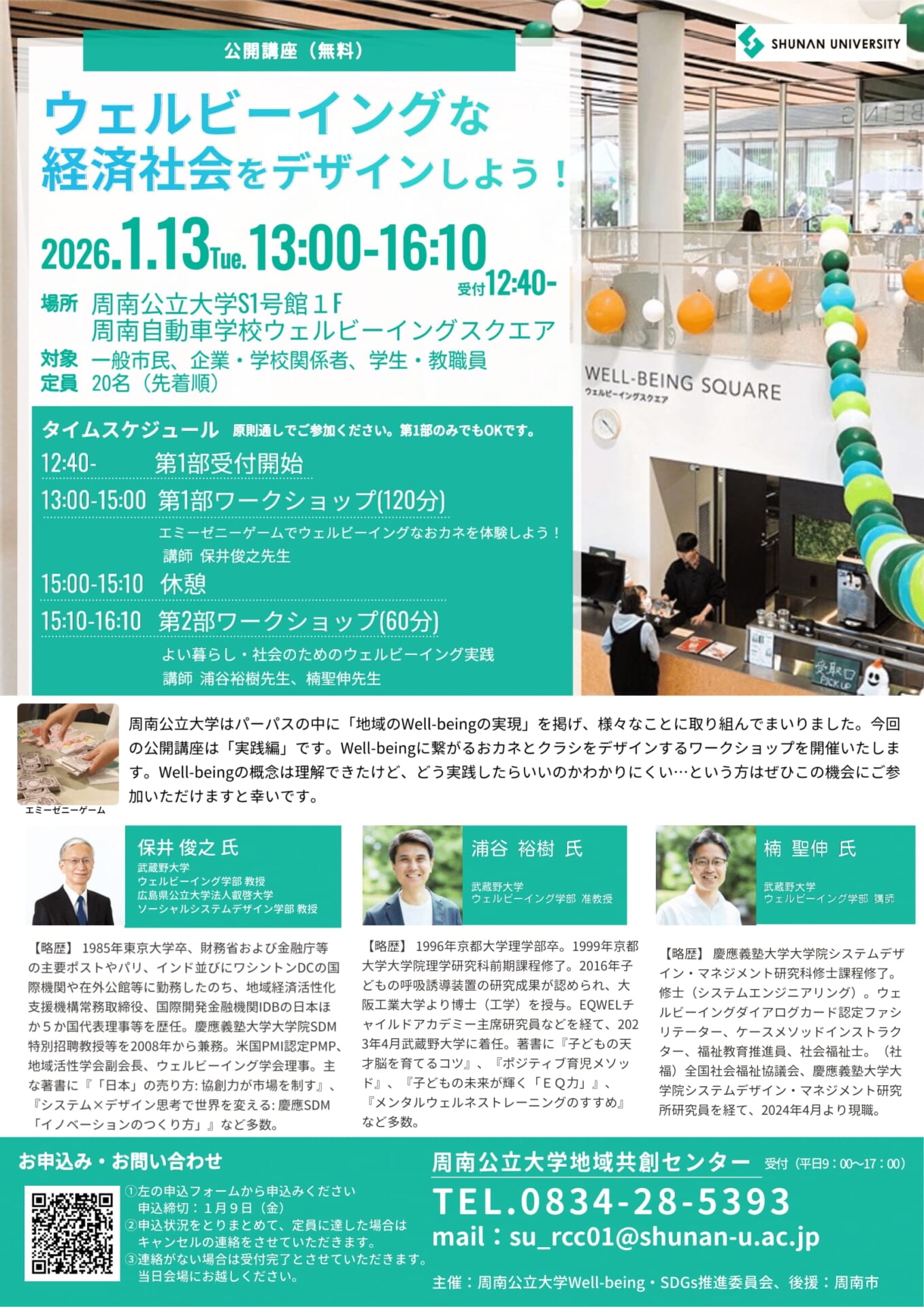 ■ 開催概要 日時:令和8年1月13日(火曜日)13時00分~16時10分 受付12時40分~ 場所:周南公立大学S1号館1階 周南自動車学校ウェルビーイングスクエア キャンパスマップはこちら 注)場所は周南自動車学校ではなく、周南公立大学内です。 講師:保井 俊之 氏(武蔵野大学 ウェルビーイング学部 教授、広島県公立大学法人叡啓大学 ソーシャルシステムデザイン学部 教授) 浦谷 裕樹 氏(武蔵野大学 ウェルビーイング学部 准教授) 楠 聖伸 氏(武蔵野大学 ウェルビーイング学部 講師) 対象:一般市民、企業・学校関係者、周南公立大学の学生・教職員 定員:20名(事前申込制) 参加費:無料 主催:周南公立大学Well-being・SDGs推進委員会 後援:周南市