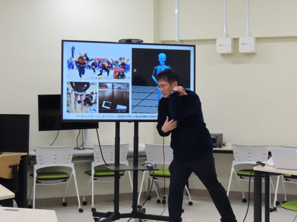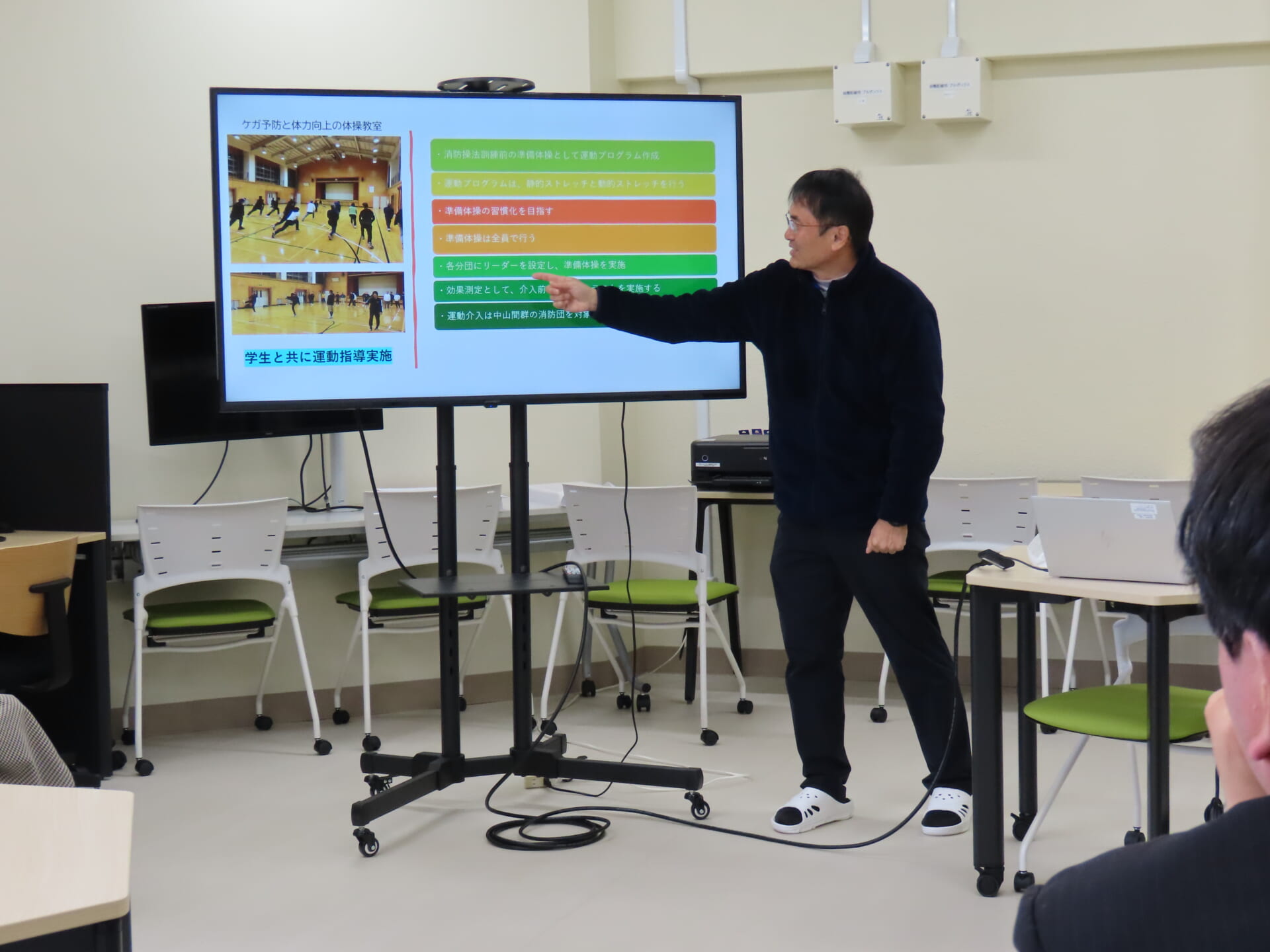 本学人間健康科学部スポーツ健康科学科のランチタイムミーティングでは、本学の教育力向上および研究力向上を目的とした教員交流の場として、月1回開催しています。12月18日(木曜日)のランチタイムミーティングにおいて、令和7年度消防団の力向上モデル事業「大学のリソースを活用した消防団員の能力向上プロジェクト」の中間報告を行いました。この事業は、総務省消防庁の「消防団の力向上モデル事業」で採択され、周南市から委託を受けて実施しているものです。消防団員の訓練時のケガの発生や、団員の高齢化が懸念される中、大学の知見・人的リソースを活用し、消防団員の能力向上を図ることを目的としています。本研究は、地域の安全を支える消防団の活動に直接寄与するものであり、今後の成果が期待されます。中間報告では、以下の内容について説明が行われました。・周南市消防団員の訓練現場における調査概要・団員を対象とした体力測定の実施と、その結果から柔軟性および持久力の低さが傾向として見られたこと・全国の消防団員の活動報告を参考に作成した運動プログラムの紹介・学生とともに2ヶ月半の運動介入を実施した経過と成果について報告し、今後の研究計画と実践に向けた展望について関連リンク→消防団オフィシャルウェブサイト