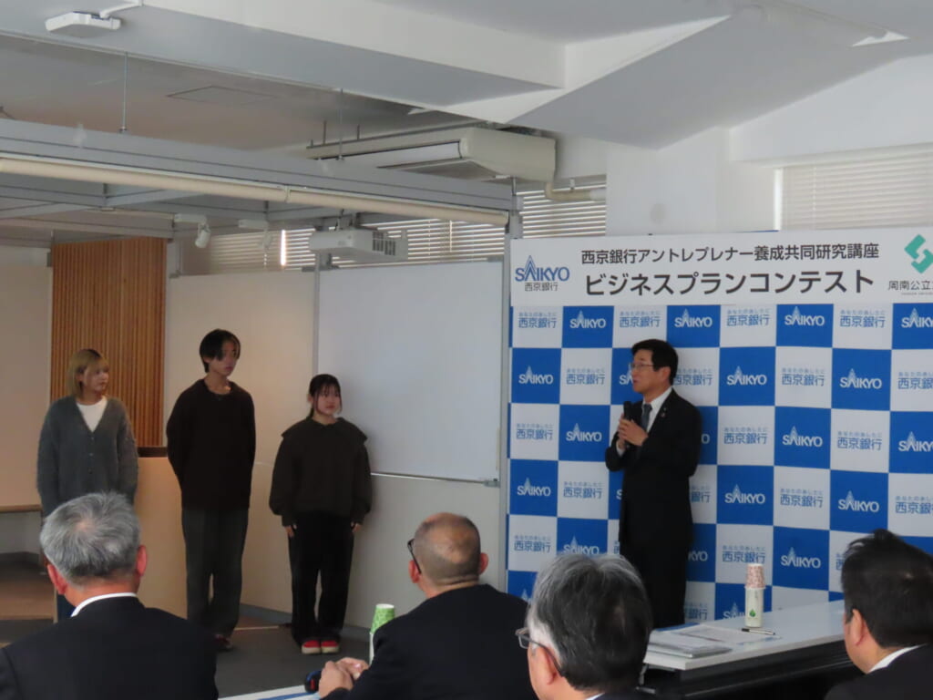 1月22日(木曜日)周南公立大学において、地域課題の解決を通じて起業マインドを育成する「西京銀行アントレプレナー養成共同研究講座」のビジネスプランコンテストを開催し、本学学生が自ら考案したビジネスプランを発表しました。本コンテストに出場したのは、周南公立大学と株式会社西京銀行が起業を目指す学生の支援・育成を目的として開講している「アントレプレナー養成共同研究講座」を半年間受講してきた学生たちです。学生たちはこれまで、市場分析やフィールドワークを重ねながら、地域や社会の課題解決につながるビジネスプランの作成に取り組んできました。第1部となる社会起業コースでは、「家庭の年収差による教育格差を解消するため『学習支援塾』の立ち上げ」、「音楽イベントやマルシェを活用し、投票行動の心理的ハードルを下げて若者の投票率向上をめざす仕組み」など、多様な社会課題に向き合った提案が披露されました。学生は、課題の深掘りから事業化の可能性まで、実践的な視点から企画をまとめ上げていました。続く第2部 企業課題解決コースでは、地域の魅力向上、交流人口の増加、若者世代の定着などに寄与することを目的とし、「観光・エンターテインメント」 をテーマに地元企業が抱える課題に若者の視点から挑戦しました。企業の現状分析を踏まえた上で、エンターテインメント性や地域資源を掛け合わせた新しい企画が提案され、地域活性化への可能性を感じさせる内容が多く発表されました。コンテストでは、多様なアイデアが次々と発表され、審査員からは「ぜひすぐにでも実際に取り組んでみてほしい」という声があがる企画もありました。学生たちの柔軟な発想力と課題解決に向けた熱意が評価された形となりました。発表した学生たちは、今回の経験を踏まえ、ビジネスプランの実現に向けて引き続き研究や活動を進めていく意欲を見せています。周南公立大学では、地域と連携しながら“実践的に学ぶ”取り組みを今後も推進し、学生が自身のアイデアを社会で活かす機会の創出に取り組んでまいります。