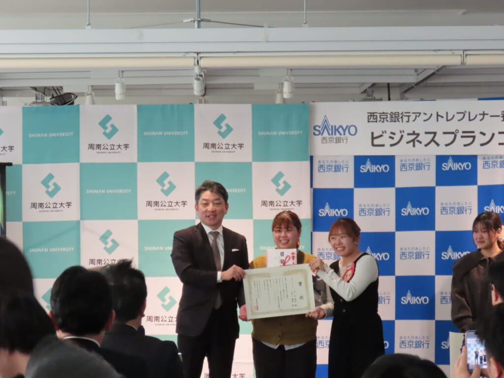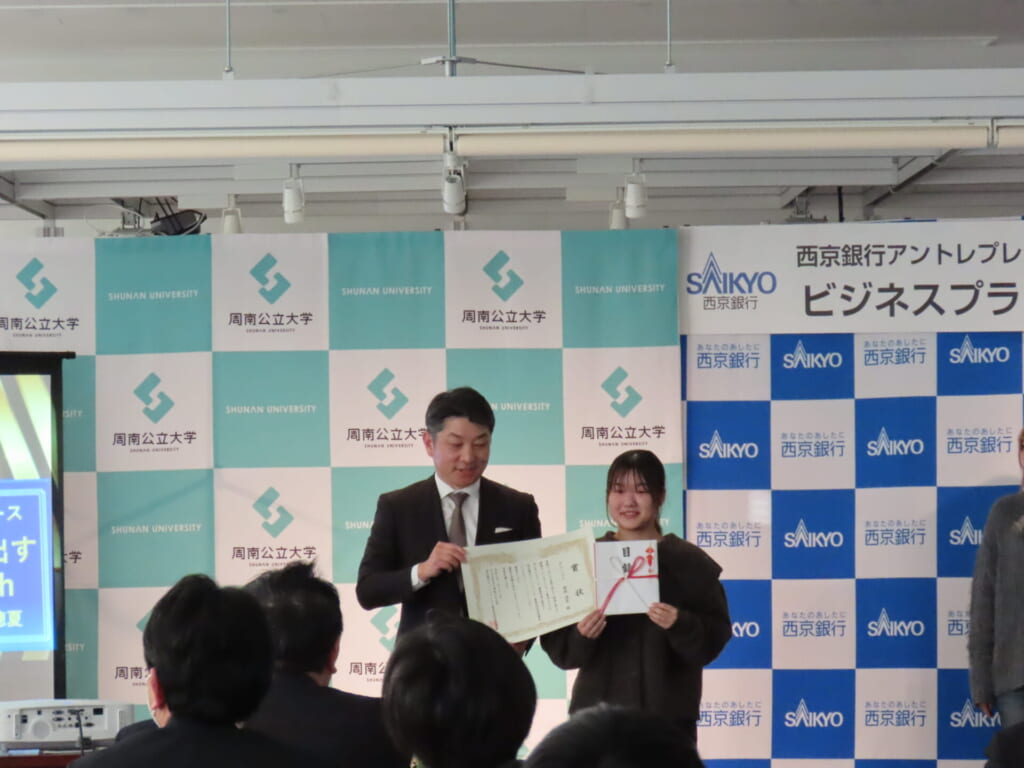 大賞受賞者第1部 社会起業コース 「もったいないをお金に変える!」 経済経営学部 1年 惣路 遥菜 家庭内のフードロス削減に向け、食品管理とポイント制度を組み合わせたアプリの提案がありました。アルバイト先で賞味期限切れ食品の廃棄を目の当たりにしたことがアイデアの出発点であり、データサイエンスの学びを生かした内容に、来場者からも注目が集まりました。第2部 企業課題解決コース 「安心を呼び出す One Touch」 株式会社ベリーネチーム 経済経営学部 1年 兒玉 琴音、情報科学部 1年 三歩一 穂夏 観光農園ベリーネで障害を持つ方が安心して働けるように「Aid Touch」というアプリを作成し、手助けが必要な時や困ったことが発生した時にタイムリーに発信でき、応援に駆け付けることができるというアプリの提案がありました。このアプリは、農園に限らず多種の企業でも実用的に使用できるのではないかと西京銀行の松岡健頭取からも好評で今後活用に期待したいと注目されました。