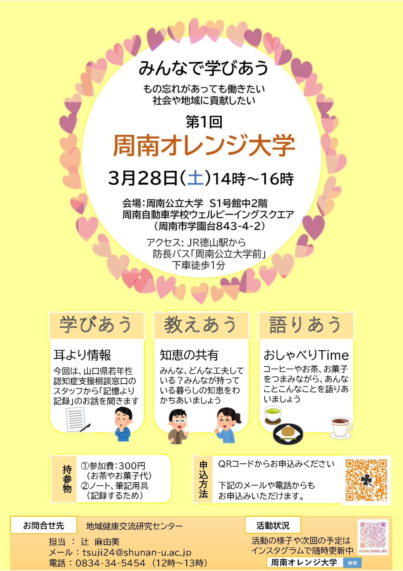 【お申し込み・お問い合わせ】事前申し込みをお願いしております。チラシのQRコードからお申し込みいただくか、電話・メールにてご連絡ください。地域健康交流研究センター(担当:辻)電話:0834-34-5454(受付時間:12:00~13:00)メール:tsuji24@shunan-u.ac.jp